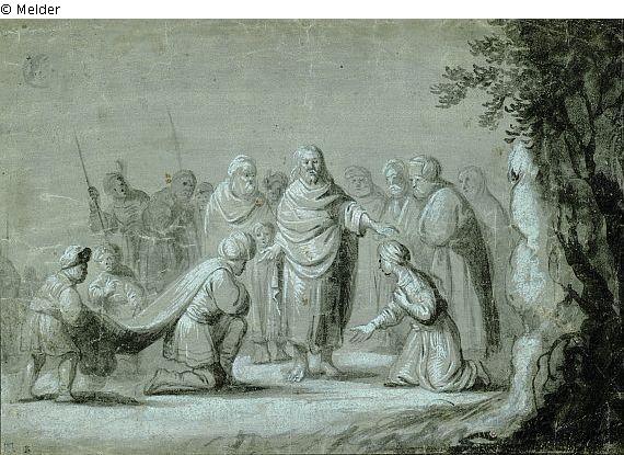 Biblische Szene, ein knieendes Paar wird von einem Mann gesegnet