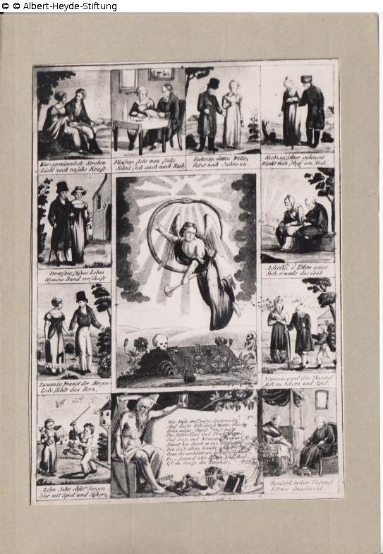 In Birkenholzrahmen ein Blatt mit Folge von elf Bildern zum Motivkreis des Lebenslaufes. Zentral ein Engel mit Posaune und den Symbolen der göttlichen Ewigkeit über einem frischen Grab. Darunter Chronos mit der Moral "Was blüht und reifet, das vergeht [...]". Beides umgeben von Illustration zu den Jahrzehnten eines Menschenlebens, links unten beginnend. Jede Szene mit zweizeiliger Legende.
