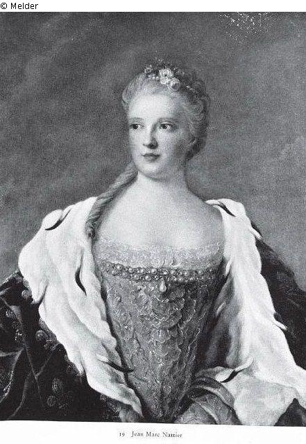 Prachtvoll glänzend die mit Spitzen gezierte silbergraue Robe. Nicht minder kostbar der blaue, mit goldenen bourbonischen Lilien bestickte und reich mit Hermelin besetzte Staatsmantel. Grau gepudertes Haar, das vom Dreiklang Gelb-Weiß-Rosa einiger Blumen belebt wird. Blaulichgrünlicher Wolkenhintergrund. Die Dargestellte, früher als Mme. Victoire de France bezeichnet, wurde späterhin als der Dauphine Maria Josepha von Sachsen identifiziert.