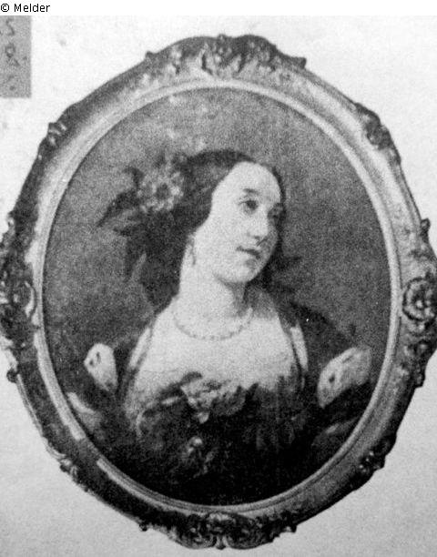 Der Blick geht nach rechts. Um den Hals eine Perlenkette, an der Brust zwei Rosen. Oval. Signiert