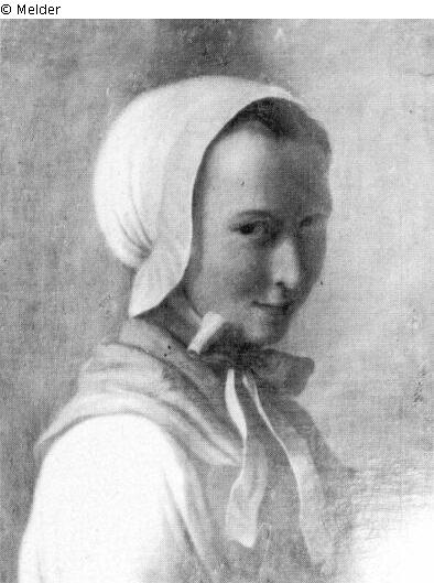 Bust length portrait, the body in profile, the head turned three quarter left. The girl has a cap tied with a ribbon under her chin and a kerchief around her neck.