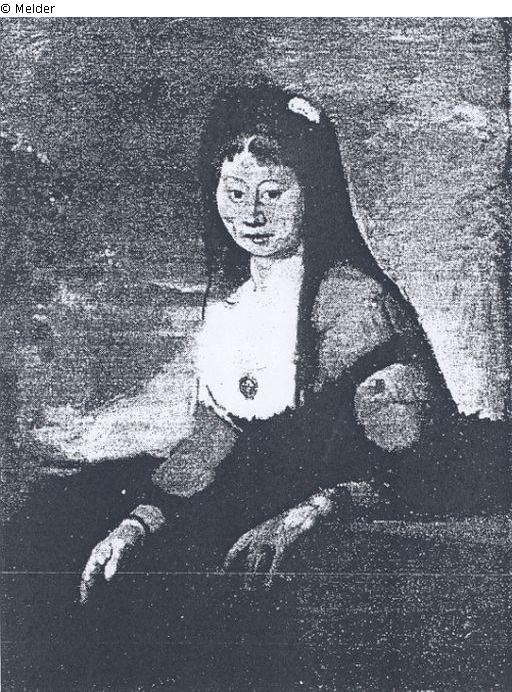 Ganz unvollendet. Das Fleisch in einer Untermalung von hellbläulichem grau, die stellenweise mit rosa gedeckt ist. In dem weiß der Spitzen spielt derselbe hellbläuliche Ton mit. Das Haar ist grau angedeutet. Der Schleier schwarz-braun. Das braun summarisch auch im rechten Ärmel und in der rechten Hand. In dem linken Arm und in der linken Hand steht das braun ganz dünn, auch grau und rosagrau. Schwarz-braunes Kleid. Das Postament auf dem rechten Arm ruht. Schmutzig braun. Die Luft blau und zwar recht heller, links dunkler. Ganz links braun angedeutetes Blattwerk.