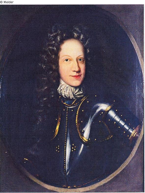 Porträt eines jungen Mannes mit einem verschmitzten Lächeln in einer glänzenden, dunklen, Rüstung mit in kräftigem Gelb gegebenen Besätzen vor dunklem Grund; den Kopf leicht zur rechten Bildseite gedreht, den Blick der blauen Augen direkt zum Betrachter gerichtet; der Porträtierte trägt eine schwarze Allongeperücke; aus der Rüstung herausschauend ein um den Hals gebundenes weiß-graues Tuch; oval oder in einer oval abdeckenden Rahmenform