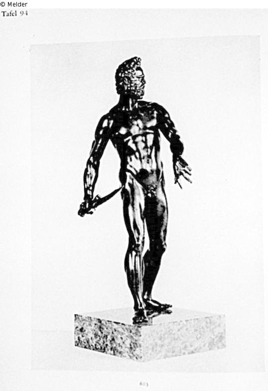Mars, nackt, hochaufgerichtet in schreitender Stellung. In der Rechten das Schwert, die Linke Vorgestreckt. Dunkelbraune Naturpatina mit Lackresten. Auf Marmorsockel. Florenz.