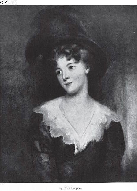 Über dem dunkelgrünen Kleid ein duftiger weißer Kragen. Der Hut schwarz, mit schwarzen, graugrün schimmernden Federn. Dunkelblondes Haar; braune Augen. Der links kräftig rote Grund erscheint ganz rechts gelblichbraun aufgehellt, mit schwärzlichem Schlagschatten unten. Wohl das von W[illiam] McKay & W[illiam] Roberts: John Hoppner, R.A., London 1909, S. 289, erwähnte Bildnis aus dem Besitze von Messrs. Lawrie & Co., das am 28. Januar 1905 bei Christie's versteigert wurde.