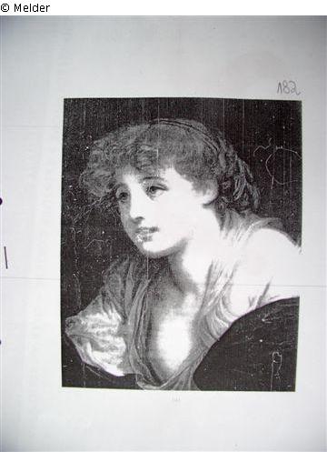 Dreiviertelprofil nach links. Im braunen gelockten Haar, ein blaues Band, über dem weißen Gewand ein blaugrauer Mantel, dunkler Grund; Abb.: Répertoire des biens Spoliés en France, Nr. 240