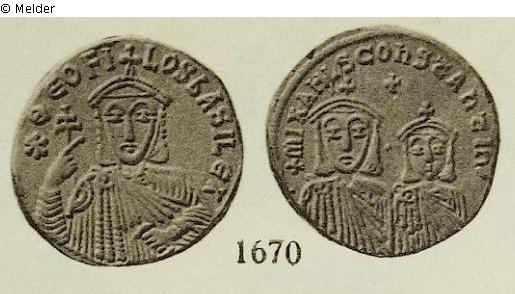 Goldsolidus des Kaisers Theophilus , Av. Brustbild Theophilus' mit Diadem, Patriarchenkreuz und Akakia, frontal, + MIXAhL S COnStAntIns, Rev. Brustbilder Michaels II. und Constantins mit Diadem frontal, * ΘEOFILOS bASILEs Θ. Vgl. Cahn, Frankfurt, Versteigerungs-Katalog No. 75 (1932) Nr. 1670.