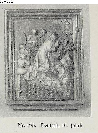 SNK: Für ähnliche Darstellung vgl. Georg Swarzenski: Deutsche Alabasterplastik des 15. Jahrhunderts. In: Städel-Jahrbuch Ser. 1 (1921), S. 167ff, Abb. 166; SNK 243: Verkauf durch Fa. Fornach, Wien; Dorotheum: 235 Alabasterrelief auf Schieferplatte mit Darstellung Christus am Ölberg, in dem von einem geflochtenen Weidenzaun umsäumten Ölberg kniet Christus vor dem Kelch, während der Engel mit dem Kreuz ihm in den Wolken erscheint, unter ihm die drei schlafenden Jünger, auf der anderen Seite schicken Judas und die Häscher sich an, den Zaun zu übersteigen, 36 x 28, deutsch, 15. Jahrh. (siehe Abb. Tafel 34)