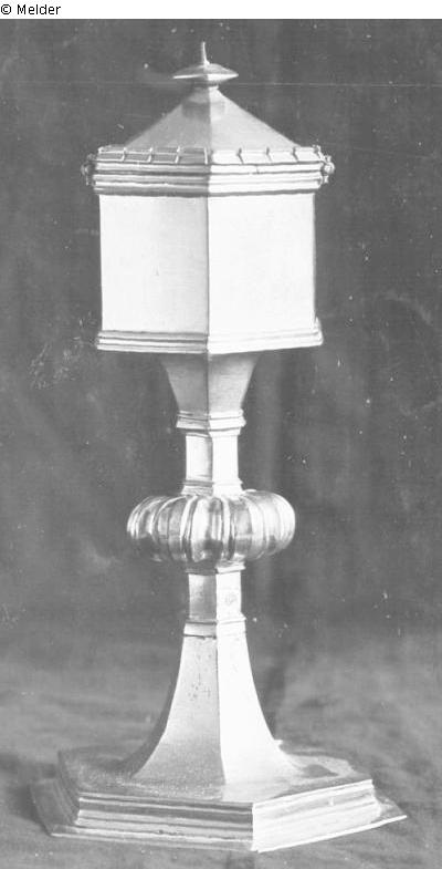 Sechskantig gescheifter Fuss mit Nodus. Gehäuse mit Zinnen und zugespitztem Dach. (Helbing: Bronze)