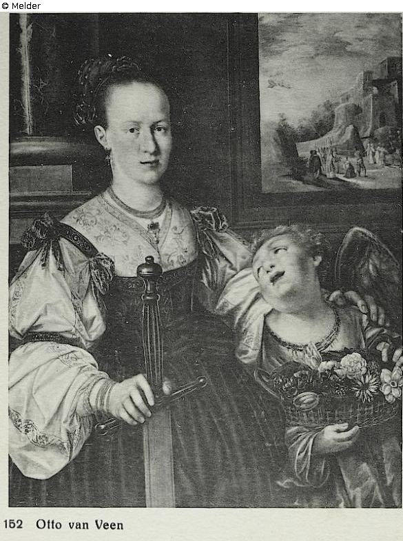 Kniebild fast von vorn. Sie stützt die Rechte auf ein großes Zweihänderschwert und legt die Linke auf die Schulter eines neben ihr stehenden Engels, der, ein Körbchen mit Blumen haltend, schwärmerisch zu ihr aufblickt. Rotes Kleid, weiße Bauschärmel; Perlen und Bänder im rötlichen Haar. Durch eine hintere Wandöffnung rechts blickt man in eine Landschaft mit Burg, vor der sich das Martyrium der heiligen Katharina in kleinen Figuren abspielt. Gemäß einem rückseitigen Wappensiegel mit Inschrift "Palais Royal F. W. o. F. Varsovie" stammt das Bild aus dem Kgl. Schloß in Warschau. Quelle: Hugo Helbing Kunsthandlung und Kunstversteigerungshaus: Kunstbesitz eines Berliner Sammlers. Katalog Nr. 49; Math. Lempertz'sche Kunstversteigerung: Eine bekannte Süddeutsche Privatsammlung und anderer Privatbesitz, Katalog Nr. 395. (DOI: Externer Link) (DOI: Externer Link)