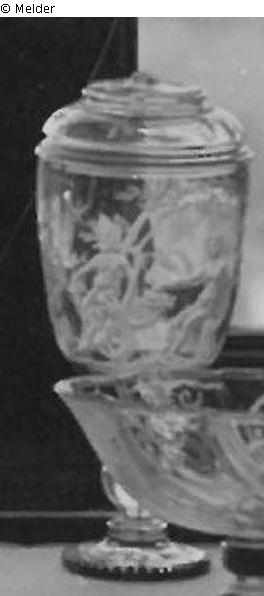 Deckelbecher mit Mattschliff: Bacchus und Ceres unter Blumen sitzend. Am Deckel Insekten. Fuß aus vergoldetem Silber. Deckelknauf fehlt.