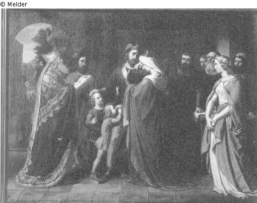 In einem Innenraum steht links mit zum Gebet erhobenen Händen ein Bischof in prächtigen Gewändern; in der Bildmitte ein einfach gekleideter bärtiger Mann mit Jakobshut, der mit der rechten Hand einem Knaben über das Haar streicht; eine weiteres kleineres Kind stützt sich an den Oberschenkel des Mannes, der im rechten Arm eine Frau hält, die in trauriger Stimmung die Hände auf die Brust ihres Mannes gelegt hat; rechts weiter höfische Personen; links der Durchblick ins Freie; Signatur: SC (ligiert) 1856/7; Maße: 86 x 111 cm