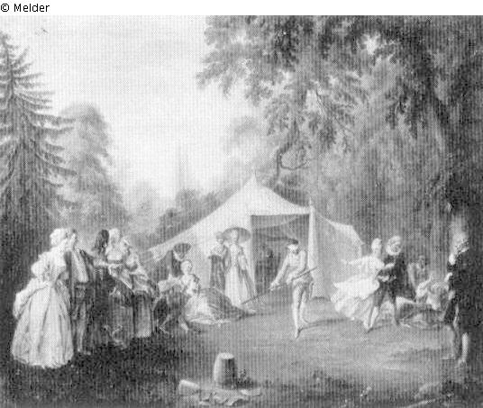 Tafelmalerei: Bild: Erwachsene spielen Kinderspiele; Spiel; Wettstreit; Spiel; Wettstreit; Kinderspiele; Signatur: l.l.: D. Chodowiecki/1768; Maße: 63 x 78 cm