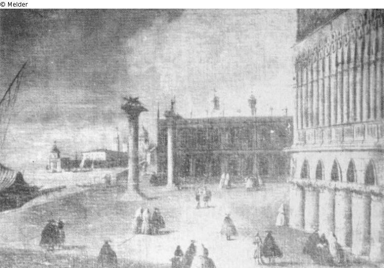 The crowded piazza with a part of the Doge¿s Palace to the right and the St. Mark column to the left.