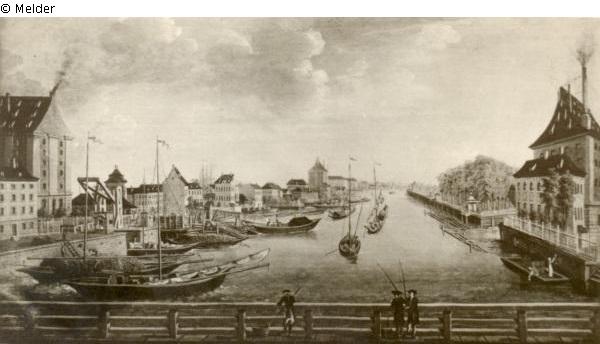 Blick von der Waisenbrücke spreeaufwärts, "dargestellt ist die Waisenbrücken, mit dem Blick auf die Splittgerbersche Zuckersiederei, anderen Stelle seit 1908 das Märkische Museum steht" Bericht über d. Neuerwerbungen d. Märkischen Museums im Jahr 1928, S. 33, Abb. Nr. 14 S. 35