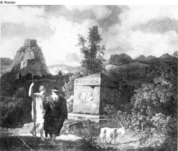 To the left, in a mountainous landscape near a monument with two profile relief portraits, are two men, one of them depicted with his back to the viewer. A goat to the right.