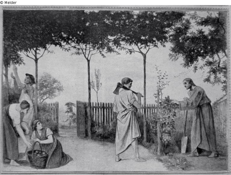 Eine Folge von fünf Bildern nach den Wandgemälden in der Aula des Kaiser Friedrich Gymnasiums in Frankfurt/Main: "An ihren Früchten sollt ihr sie erkennen." Es ist Erntezeit. In der Mitte vorn harrt der Knecht, die Axt auf der Schulter, dem Befehle des Herrn, der die Früchte prüft. Links sind Knechte und Mägde mit der Obsternte beschäftigt und im Hintergrund, jenseits der geöffneteten Gartentür, wird dürres Holz verbrannt. Schlanke Obstbäume stehen gegen den Himmel, r.u. Monogramm des Künstlers. Die Abbildung zeigt das erwähnte Wandgemälde, das als Vorlage diente. Gemalt 1903.
