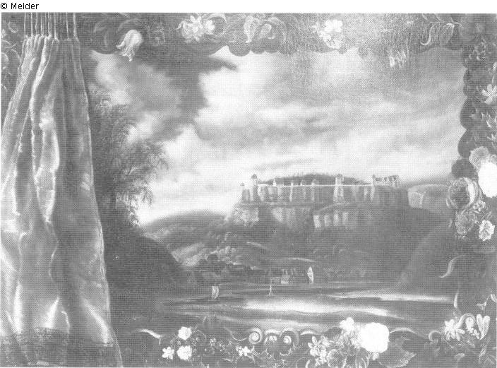 Ansicht von der rechten Elbseite aus. Tiefblauer, mit Wolken bedeckter Himmel, die Flußbiegung mit zwei Segelbooten belebt, halblinks die signatur: J. Rauscher pinxit. Die Landschaft wird von einer breiten Blätter- und Blumenranke im Charakter seiner Blumenstücke umrahmt, links von einem gelbseidenen Vorhang mit breitem Spitzenbesatz begrenzt.