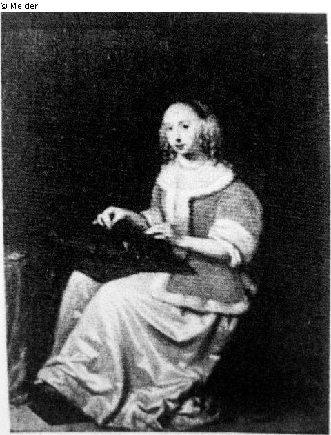 Vornehme Dame in weißem, mit Silberlaméstreifen besetztem Atlaskleid und roter, pelzverbrämter Schoßjacke, an einem niedrigen Tisch sitzend. Auf den Knien ruht das Klöppelkissen, die Hände halten zwei Klöppel und erscheinen im Begriff, die Arbeit unmittelbar fortzusetzen. Der Blick ist voll dem Beschauer zugewandt. Literatur: Galerie Dr. Schäfer, Berlin, 1929, Die Meister des holländischen Interieurs, Kat. Nr. 64