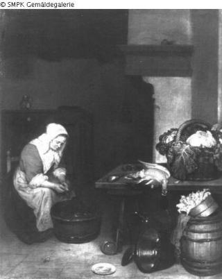 Tafelmalerei: Bild: Kücheninneres & Zubereitung von Lebensmitteln, im Haus; innen (gelegen) & Mahlzeit; im Haus; Bez. an der Tischplatte; Signatur: CN (verbunden) etscher; Maße: 72 x 58 cm