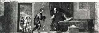 Tafelmalerei: Bild: der Kämmerer, der entlassen werden soll, vermindert die Schulden der Schuldner seines Herrn; Kämmerer; Schuldner