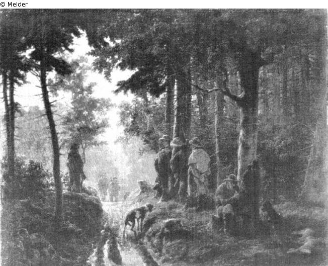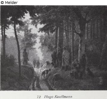 Ein Platzregen hat die Jäger und Treiber veranlaβt, unter hohen Bäumen Schutz zu suchen. Bez. r. u.: Hugo Kauffmann, Goldrahmen.