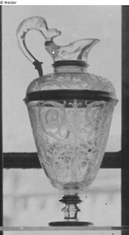 Hoher, kelchförmiger Pokal mit schlankem Fuß und geschliffenem Rankenwerk. Darauf eine flache Kanne als Deckel. Am Henkelansatz ein Streifen aus weißem Email. Vierfache silbervergoldete Fassung.