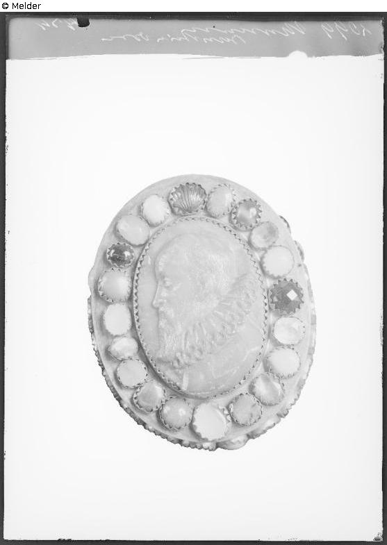 Ovale silberne Dose mit bunten Glasflüssen und Steinen besetzt. Auf dem Deckel ovale Reliefplatte: Brustbild des Herzogs Johann Casimir von Sachsen Coburg (?).