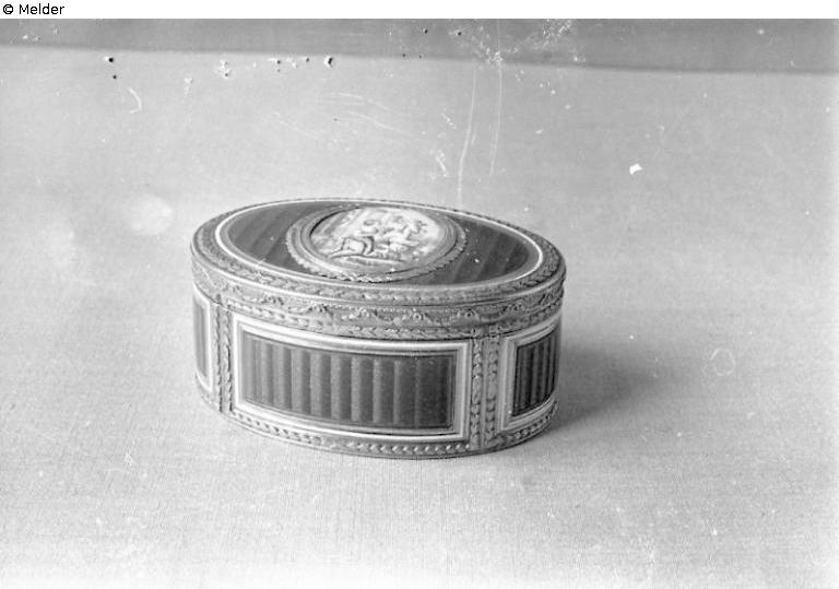 Oval, Klappdeckel. Aus Gold. An den Rändern profilierte und mit plastischen Lorbeergirlanden in zweifarbigem Gold verzierte Leisten, verbunden durch vier ähnlich dekorierte Stege. Flächen von weißen Emaillinien umrahmt aus durchsichtigem orange Email über guillochiertem Grund. Auf Deckel in goldenem Lorbeerrahmen ovale Emailminiatur: Knieendes Mädchen bringt den Standbild des Amor ein brennendes Herz. Auf Sockel Inschrift: Vous les Merit se tous 1775 Inneres glatt Gold. Gewicht: 188 g, Marke: Auf Boden und Seitenwand Jb. F (gekrönt) 1769 - 1770, Paris. Pächterz. etwa R.6524a, Julien Alaterre, 1768 - 1774. Mrz. EF, nicht bei R. Auf Stulp Quittungsz. Vogelkopf, nicht bei R.