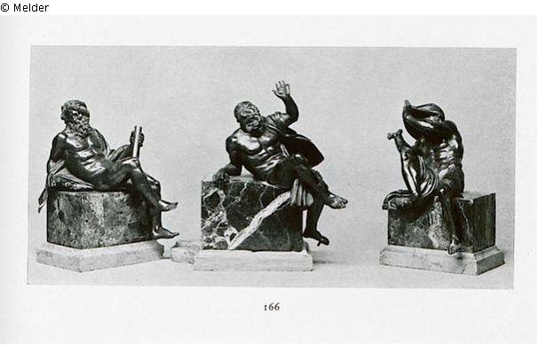 Flußgötter. Athletische Gestalten mit reich bewegten Gewändern, auf farbige Marmorsockel gelagert. Nach dem Brunnen des Lorenzo Bernini auf der Piazza Navona in Rom.