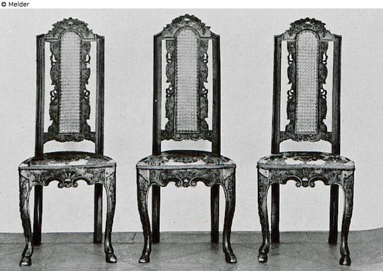 geschnitzt, auf leicht geschwungenen Beinen mit Bocksfüßen, Palmetten und Akanthuslaub. Das Mittelbrett der Lehne mit Rohr geflochten und mit Akanthusvoluten verziert. Bezüge aus altem, rotem Genueser Samt. Deutsch, um 1720. Literatur: Auktionskatalog Hans W. Lange, Wertvolles Kunstgewerbe, Berlin, 19.-21. Mai 1941, S. 21. Nr. 64, Taf. 12 (DOI: Externer Link)