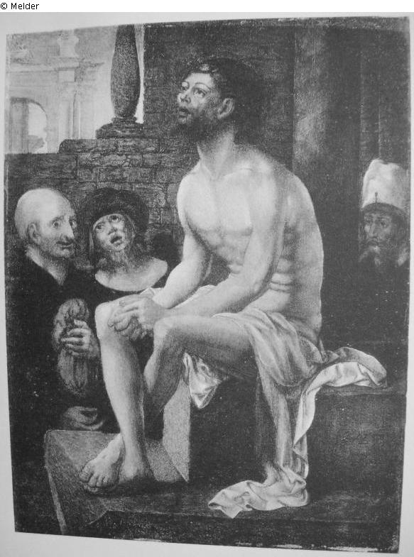 Ecce homo, Der Heiland sitzt nackt mit gekreuzten Beinen vor einer Säule, links ein glatzköpfiger und ein bärtiger Mann mit Haube, rechts ein anderer mit einem Turban, sign. auf dem Postament unten: Johannes Malbodius pingebat 1527