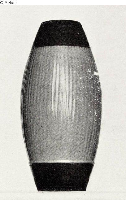 fein gerippt, mit zart gesprüngelter apfelgrüner Glasur überzogen. Am Rand und Fuß dunkelbraun glasiert mit gravierter Palmettenbordüre. China. Kang-hsi.