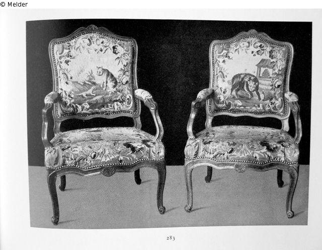 Kurvierte und geschnitzte Nußholzgestelle. In Wolle und Seide gewirkte Aubusson-Tapisseriebezüge: auf rosa Fond weiße, von Blumen und Rocaillen eingefaßte Felder mit Tierdarstellungen nach Lafontaine.