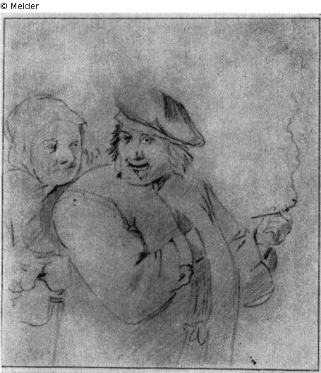 Ein rauchender Bauer, hinter ihm seine Frau