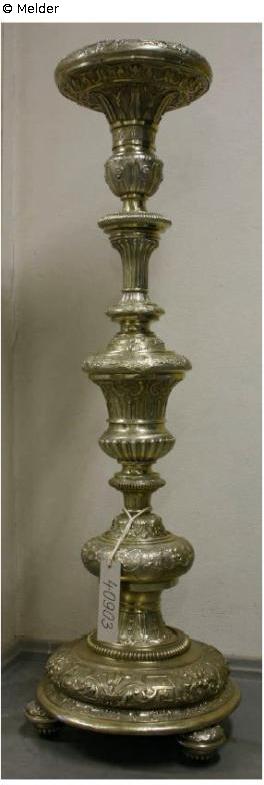 Es handelt sich um einen aufwendig verzierten Silbergueridon eines ehemals vorhandenen Gueridonpaares.Der Gueridon enthält mehrere Zierlemente. In der Mitte befindet sich ein großes kelchartiges Zierelement. Oben befindet sich der verzierte Teller.