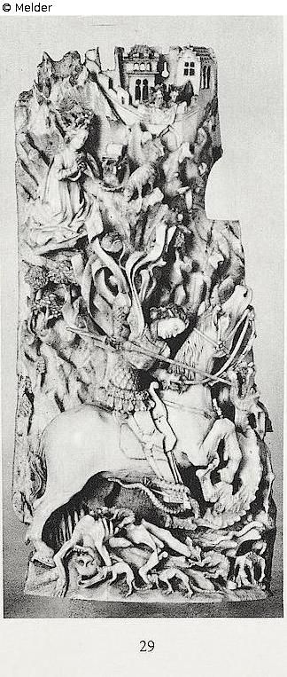 Hoch zu Roß, mit der Lanze den Drachen tötend, der sich vor ihm aufbäumt. Am Boden ein Skelett, an dem Hunde nagen. Der Ritter mit kurzem tief gegürtetem Panzerrock und flatternden Bändern an der Schulter. Rückwärts auf felsigem Berggelände die Königstochter, im Gebet kniend; auf der Höhe ein befestigtes Schloss. Figuren fast vollplastisch mit tiefen Unterschneidungen. Quelle: Hugo Helbing Kunsthandlung und Kunstversteigerungshaus: Kunstbesitz eines Berliner Sammlers. Katalog Nr. 49. (DOI: Externer Link)