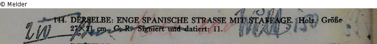 Sammlung Eduard Fuchs bis 1933; 25.10.1933 Beschlagnahmung durch die Gestapo; Versteigerung Auktionshaus Rudolph Lepke, Berlin, Katalog 2114. S. 16. Am 16. und 17.06.1937 wurde das Gemälde als Nr. 144: „Max Slevogt: Enge spanische Straße mit Staffage. Holz. Größe 27 x 21 cm. Pfälzische Landschaft, im Vordergrund ein Weg. Pappe. Gr[öße] 34 x 50cm, G.[old] – R.[ahmen]. Signiert und datiert: 11“ versteigert; ersteigert von einem bisher nicht identifizierten Kunsthändler bzw. Sammler für 210,- RM (Schätzpreis: 150,- RM); Verbleib unbekannt