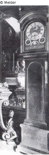 Pendant zu VII 1. Eine große englische Spieluhr, in einem, mit Nussbaum furnierten Gehäuse, oben mit drei metallischen, vergoldeten Knöpfen, sign. "Claudius Du Chesne Londini fecit".