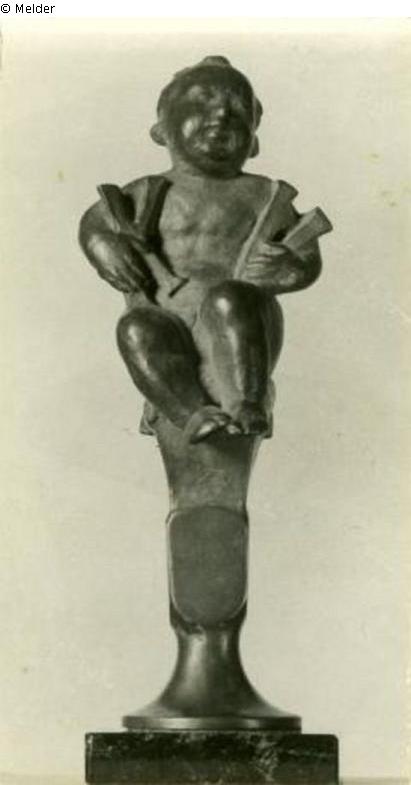 Ein geflügelter Putto mit angezogenen Beinen auf einem balusterartigen Aufsatz sitzend, hält in den Armen die Initialen K. V. des Künstlervereins. Nicht in grösserer Auflage ausgeführter Entwurf für eine Jubiläumsfestgabe des Kunstvereins (1928).