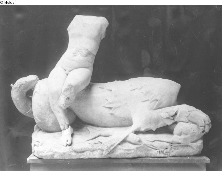 Nackter Jüngling (Eros?) seitlich auf einem Hippokamp sitzend; Zustand: fragmentiert; Kopf, Arme und das linke Bein des Jünglings ab dem Knie sowie der Kopf des Hippokamps fehlen.
