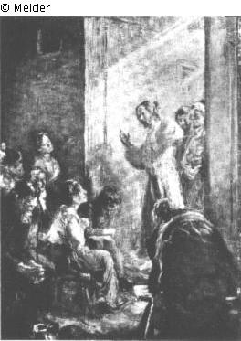 Christus erscheint den Gläubigen in Begleitung zweier Jünger, bez. F. Uhde
