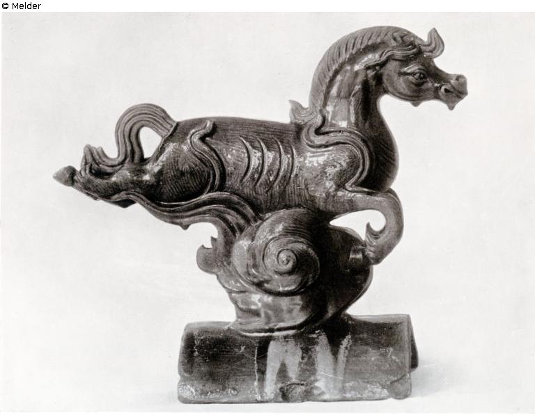Sammlung Eduard Fuchs, erworben zwischen 1912–1922 und in dessen Besitz bis 1933; 25.10.1933 Beschlagnahmung durch die Gestapo; zwangsweiser Verkauf (Zahlung Reichsfluchtsteuer) 1937 durch seine Tochter Gertraud Fuchs: Versteigerung Auktionshaus Rudolph Lepke Berlin, Katalog 2115, S. 33 - am 15.10 und am 16.10.1937 wurde dieser Dachreiter unter Nr. 514 versteigert: „FAYENCE-DACHREITER: Über Wolken galoppierendes Pferd; gelb und grün glasiert. Höhe 33 cm. Ming (Schwach beschädigt)“.