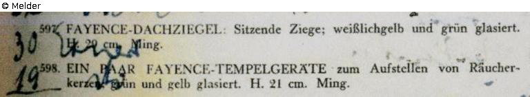 Sammlung Eduard Fuchs, wahrscheinlich erworben nach 1924 und in dessen Besitz bis 1933; 25.10.1933 Beschlagnahmung durch die Gestapo; zwangsweiser Verkauf (Zahlung Reichsfluchtsteuer) durch seine Tochter Gertraud Fuchs: Versteigerung Auktionshaus Rudolph Lepke Berlin, Katalog 2115, S. 37 - am 15.10 und am 16.10.1937 wurde dieser Dachreiter unter Nr. 597 versteigert: „FAYENCE-DACHZIEGEL: Sitzende Ziege; weißlichgelb und grün glasiert. Höhe 29 cm. Ming“.