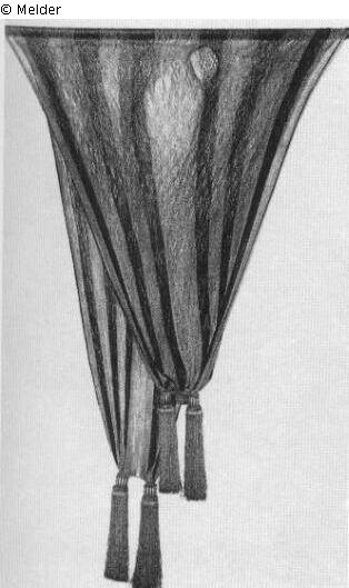 Die silberne Feldbinde hat karmesinrote Längsstreifen. Das netzartige Strickmuster enthält Karos, Zacken und Streifen. An den Enden sind je zwei lange, silberne Quasten mit rot-silbernen längsgestreiften Bünden befestigt.