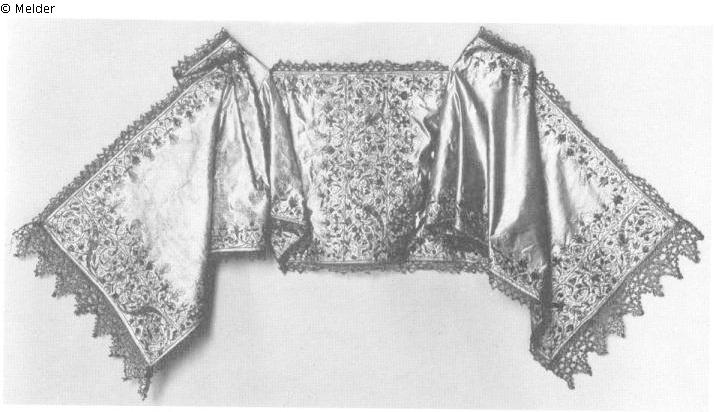 Textil (Seidenatlas) ; Textil (Seide) ; Textil (Goldspitze) / geklöppelt