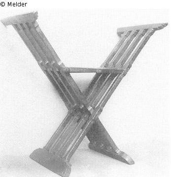Die scherenartig ineinander verschränkten Latten sind oben und unten mit Querzargen verbunden, ein oberhalb der Schere eingefügter Sitz verbindet beide Wangen miteinander.