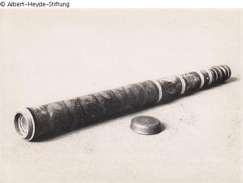 Fernrohr mit vierfachem Auszug aus mit Buntpapier bezogenem Karton. Vor dem Objektiv ein Messingdeckel mit Schraubverschluss.
