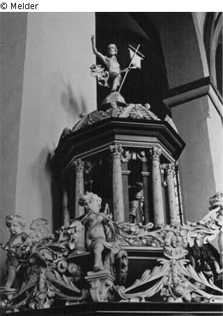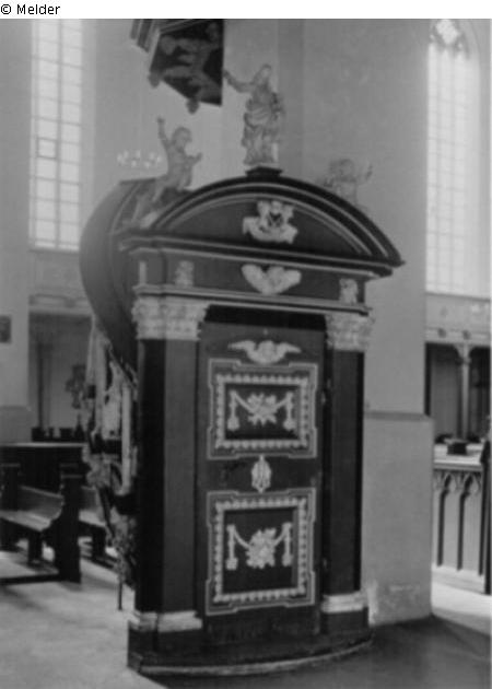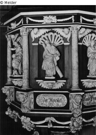 Verlustgeschichte: Im Februar 1945 wurde die vom Magdeburger Bildhauer Tobias Wilhelmi geschaffene Kanzel der Johanniskirche zum Schutz vor Kriegseinwirkungen ausgelagert. Im Auftrag der Gemeinde führte die Magdeburger Firma Hermann Habs die Demontage und den Transport durch. 51 Kisten mit den Skulpturen und dem Dekor der Kanzel sollten in den von der Rüstungsindustrie genutzten unterirdischen Anlagen in Halberstadt-Spiegelsberge aufbewahrt werden.