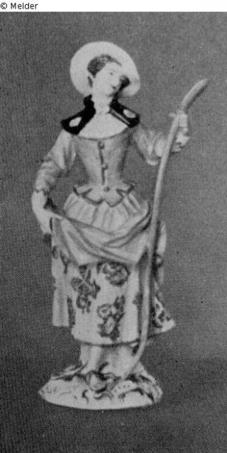 auf goldstaffierten Rocaillensockeln, er in Schreitstellung mit Pilgerflasche an Stange, sie mit Lammstab. Bunte Bemalung: Geblümter hellgelber Rock, hellvioletter, vorn geschürzter Pilgerrock, lila Taille, schwarzer Pilgerkragen, gelber Krempenhut.- Violette Hose, violetter, geblümter Schoßrock, schwarzer Pilgerkragen. Reparatur. Marke: Blaue Schwerter.